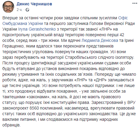 "Впервые за последние четыре года благодаря совместным усилиям офиса омбудсмена и первого заместителя Председателя Верховной Рады Украины Ирины Геращенко с территории так называемой "ЛНР" на подконтрольную украинской власти территорию возвращены первые 42 человека, среди которых - три женщины. Мы благодарны Людмиле Денисовой и Ирине Геращенко, которым удалось таки убедить представителей террористических группировок вернуть наших граждан. Все они сейчас находятся на территории Старобельского следственного изолятора", - говорится в опубликованном сообщении.