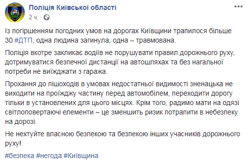 В аэропорту "Борисполь", тем временем, начали массово задерживаться рейсы. После ухудшения погодных условий на дорогах Киевской области произошло более 30 ДТП. В результате один человек погиб, еще один травмирован. Об этом сообщает отдел коммуникации полиции Киевской области.