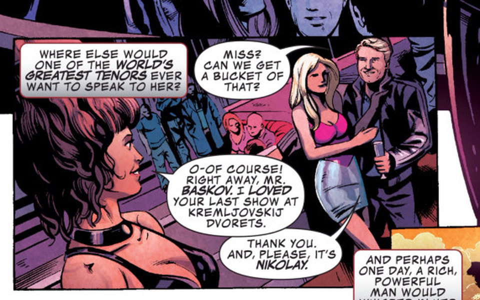 В частности, в статье говорится: "Николай Басков - оперный певец, считающийся одним из величайших теноров в мире. Николай Басков посетил один из самых горячих ночных клубов Москвы, флиртовал с женщинами и пригласил одну из хостесс выпить. Он не знал, что хостесс на самом деле была агент Щ.И.Т.а Наташа Романова, которая выполняла секретную миссию по сближению с российским торговцем оружием Михаилом Федоровым".