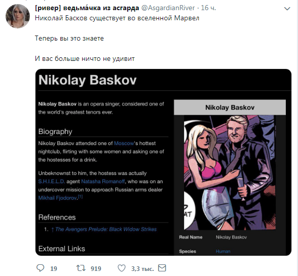 Девушка выложила скриншот фанатского сайта Marvel Cinematic Universe, который использует ту же структуру, что и Википедия и посвящен вселенной Marvel. На странице указано, что Николай Басков встречается в комиксе The Avengers Prelude: Black Widow Strikes ("Мстители. Вступление: Черная вдова атакует"). Выпуск посвящен русской шпионке, агенту Щ.И.Т.а Наташе Романофф.