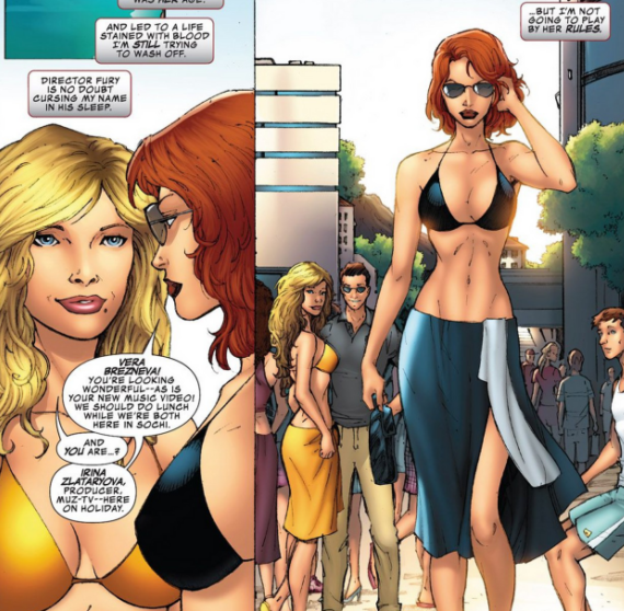 Как пишет Esquire, в этом же выпуске комикса появляется певица Вера Брежнева. Она отдыхает в Сочи после записи своего клипа, ей звонит Черная Вдова и, представившись продюсером музыкального канала, предлагает ей пообедать. Романофф это нужно, чтобы обеспечить себе алиби.