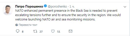 Вместе с тем, в официальном аккаунте Порошенко в Twitter после пресс-конференции был размещен твит на английском языке следующего содержания: "Усиление постоянного присутствия НАТО в Черном море необходимо для предотвращения дальнейшей эскалации напряженности и обеспечения безопасности в регионе. Мы приветствовали бы запуск (англ. "We would welcome launching" – Прим. Ред.) миссий НАТО по воздушному и морскому мониторингу".