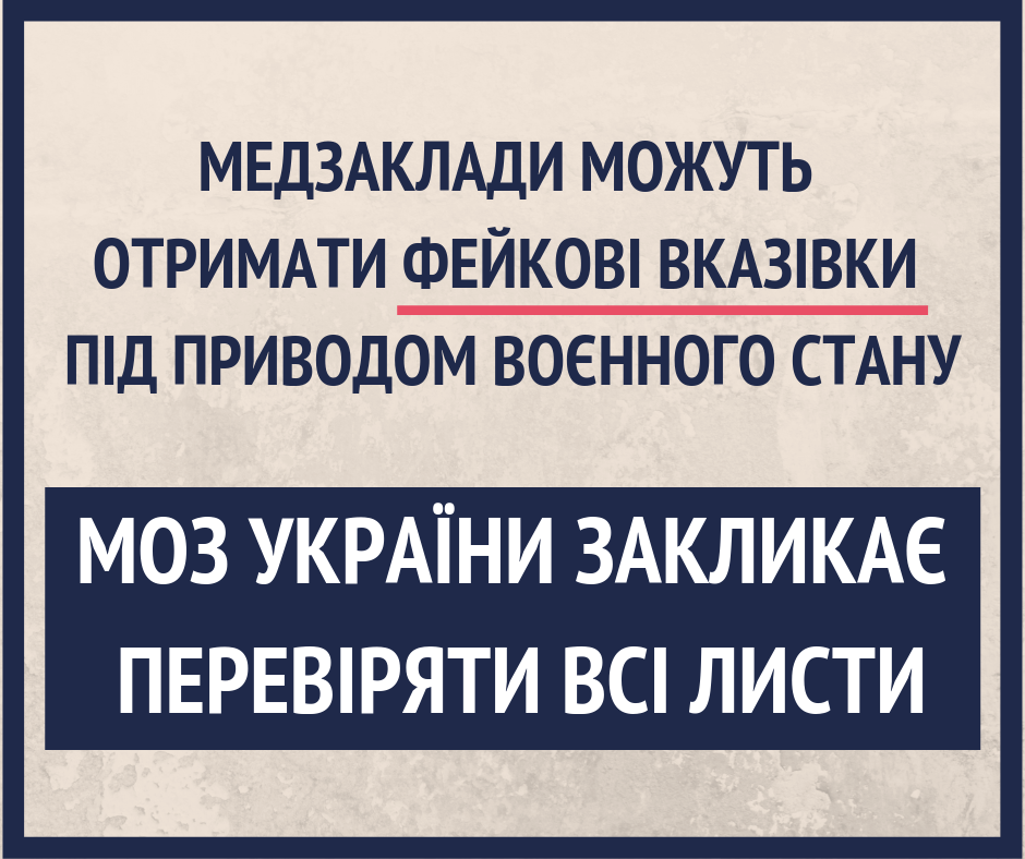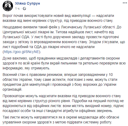В Минздраве предупредили больницы о рассылке неизвестными фейковых указаний относительно действий во время военного положения. Такой случай зафиксирован в городской больнице Лисичанска Луганской области. Об этом говорится на странице и. о. министра здравоохранения Украины Ульяны Супрун в Фейсбуке в пятницу, 14 декабря.