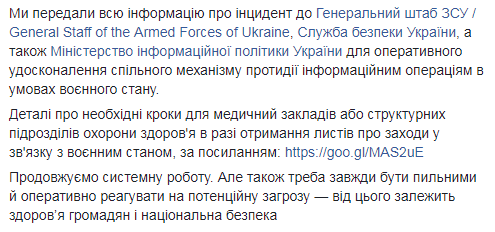 Министерство здравоохранения передало всю информацию об инциденте в Генеральный штаб ВСУ, СБУ, а также Министерство информационной политики Украины.