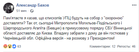 "Помните я говорил, что епископов УПЦ будут на собор с "охраной" доставлять? Так вот, сегодня Митрополита Могилев-Подольского и Шаргородского Агапита (Бевцик) в принудительном порядке СБУ Винницкой области доставляет в Киев. Владыку забрали из дома где он гостил в Черновицкой обл. Официальная версия - на разговор с Президентом!", - сказано в сообщении.