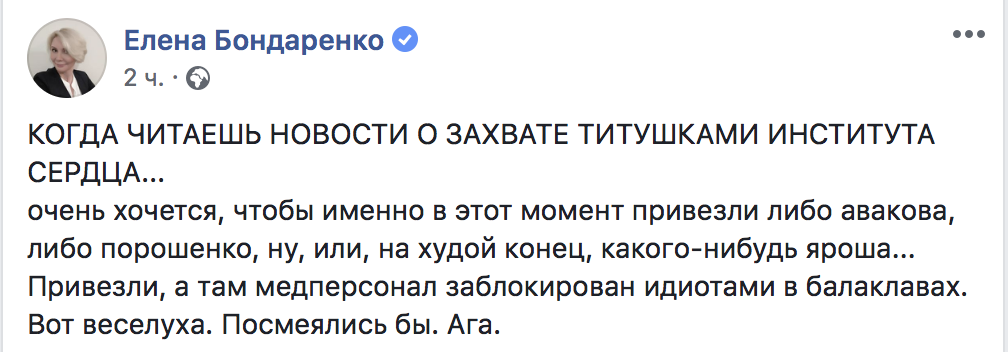 "Когда читаешь новости о захвате тетушками Института сердца очень хочется, чтобы именно в этот момент привезли либо Авакова, либо Порошенко, ну, или, на худой конец, какого-нибудь Яроша. Привезли, а там медперсонал заблокирован идиотами в балаклавах. Вот веселуха. Посмеялись бы. Ага", - написала экс-нардеп Елена Бондаренко.
