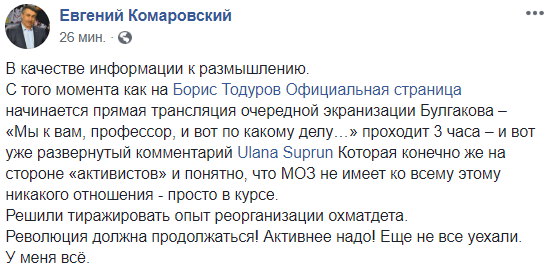 С того момента как на официальной странице Бориса Тодурова начинается прямая трансляция очередной экранизации Булгакова – "Мы к вам, профессор, и вот по какому делу…" проходит 3 часа – и вот уже развернутый комментарий Ulana Suprun Которая конечно же на стороне "активистов»" и понятно, что МОЗ не имеет ко всему этому никакого отношения - просто в курсе.