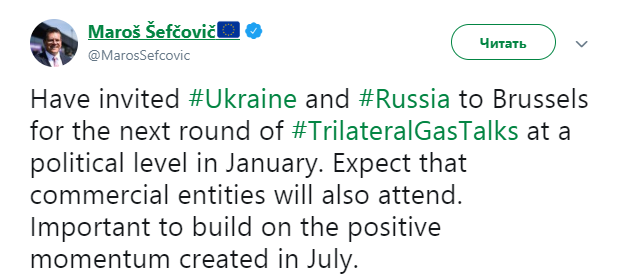"Пригласили Украину и Россию в Брюссель на следующий раунд трехсторонних переговоров на политическом уровне в январе. Ожидаем, что переговоры также посетят коммерческие структуры. Важно развивать положительный импульс, созданный в июле", - сообщил Шефчович.