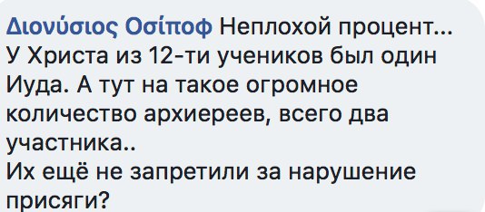 "Неплохой процент... У Христа из 12 учеников был один Иуда. А тут на такое огромное количество архиереев всего два участника [Собора от УПЦ МП]. Их еще не запретили (отстранили от церкви - прим. ред.) за нарушение присяги?", - прокомментировали пользователи сети.