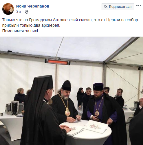 "Только что на Громадском Антошевский сказал, что от Церкви на собор прибыли только два архиерея. Помолимся за них!" - сообщил в Facebook церковный деятель Украинской православной церкви Московского патриархата архиепископ Иона (он не поддерживает проведение собора, а потому, видимо, имеет в виду, что молиться нужно за спасение грешных душ двух иерархов).