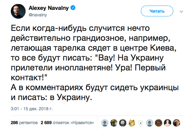 "Если когда-нибудь случится нечто действительно грандиозное, например, летающая тарелка сядет в центре Киева, то все будут писать: "Вау! На Украину прилетели инопланетяне! Ура! Первый контакт!" А в комментариях будут сидеть украинцы и писать: в Украину".