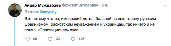Высказался и руководитель крымско-татарского телеканала "ATR" Айдар Муждабаев (в прошлом - московский журналист): "Это потому что ты, имперский дятел, больной на всю голову русским шовинизмом, расистским неуважением к украинцам, так ничего и не понял. "Оппозиционер" х*ев".