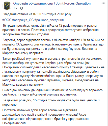 За минувшие сутки противник 12 раз нарушил режим прекращения огня, применяя в том числе вооружение, запрещенное Минскими соглашениями. Об этом в Facebook сообщает штаб ООС.