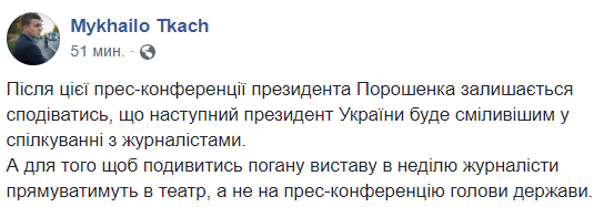 А для того чтобы посмотреть плохой спектакль в воскресенье журналисты будут направляться в театр, а не на пресс-конференцию главы государства", - отметил журналист Михаил Ткач, который опубликовал фото, как он просит слова на пресс-конференции.