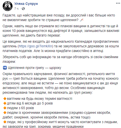 Глава Минздрава Ульяна Супрун сообщила о необходимости вакцин от дифтерии и столбняка, которые взрослый человек проходит каждые 10 лет, даже если в детстве прошел все плановые вакцинации. Об этом она написала на своей странице в Facebook.