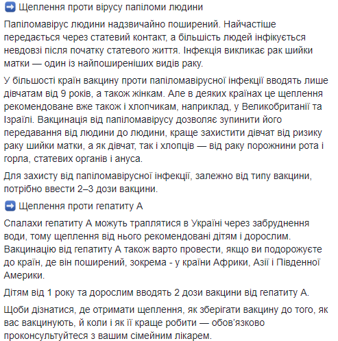 3. Прививки против гепатита А Вспышки гепатита А могут случаться в Украине из-за загрязнения воды, поэтому прививки от него рекомендованы детям и взрослым. Вакцинацию от гепатита А также стоит провести, если вы путешествуете в страны, где он распространен, в частности - в страны Африки, Азии и Южной Америки. Детям от 1 года и взрослым вводят 2 дозы вакцины от гепатита А.