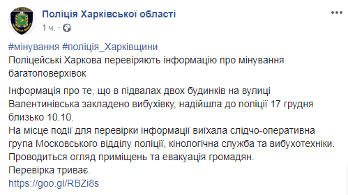 Утром 17 декабря неизвестные сообщили в полицию о минировании двух жилых домов в спальном районе Харькова. Об этом сообщает пресс-служба полиции Харьковской области на странице в Facebook.