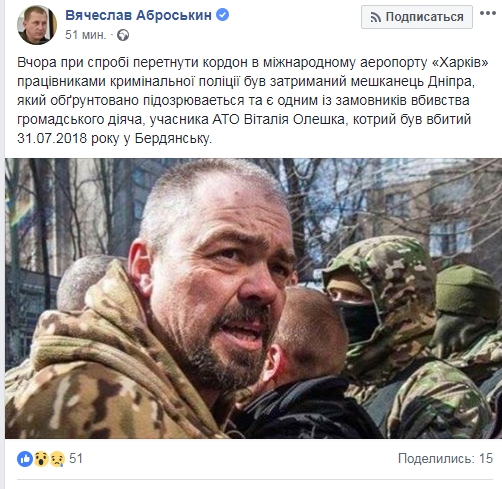 "Вчера при попытке пересечь границу в международном аэропорту "Харьков" работниками криминальной полиции был задержан житель Днепра, который обоснованно подозревается и является одним из заказчиков убийства общественного деятеля, участника АТО Виталия Олешко, который был убит 31.07.2018 года в Бердянске", - указано в опубликованном сообщении.