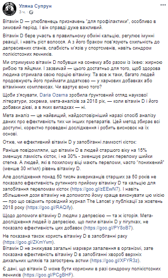 И.о. министра здравоохранения Ульяна Супрун напомнила украинцам о важности приема витамина D для профилактики, особенно в зимний период. Об этом чиновница рассказала на своей странице в соцсети.