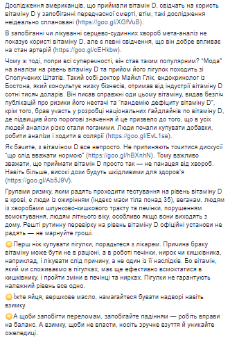 "Некий доктор Майкл Глик, эндокринолог из Бостона, который консультирует ряд бизнесов, получил от индустрии витамина D сотни тысяч долларов. Он писал настоящие оды этому витамину, выдал множество публикаций о рисках его недостатка и "пандемии дефицита витамина D", кроме того, участвовал в разработке национальных ґайдлайнив по витамину D, где повысил его пороговые значения и это привело к тому, что у всех людей анализы резко стали плохими. Люди стали покупать добавки, делать анализы и ходить в солярии!, - раскрывает причину популярности витамина чиновница и добавляет, что принимать витамин D просто так - не панацея от болезней. Более того, высокие дозы будут вредными для здоровья.