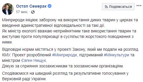 "Минприроды инициирует запрет на использование диких животных в цирках и введение административной ответственности за такие действия. Как министр экологии, считаю неприемлемым такое использование животных и выступаю против популяризации в обществе жестокого обращения с ними", – отметил Семерак. Он добавил, что соответствующие нормы содержатся в проекте закона, который был представлен на рассмотрение Кабмина. Проект разработан Минприроды и поддержан Минкультом.