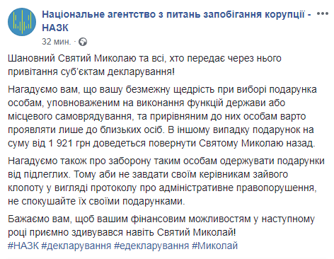 Накануне Дня Святого Николая Национальное агентство по вопросам предотвращения коррупции (НАПК) напомнило чиновникам, какие подарки им нельзя принимать. Об этом НАПК пишет на своей странице в Facebook.