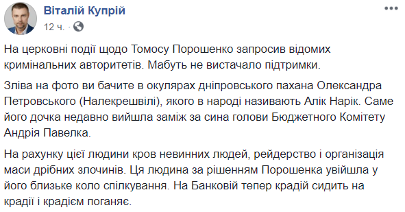 На счету этого человека кровь невинных людей, рейдерство и организация массы мелких преступлений. Этот человек по решению Порошенко вошел в его ближний круг общения. На Банковой теперь вор сидит на воре и вором погоняет", - пишет нардеп Виталий Куприй.