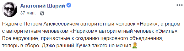 "Рядом с Петром Алексеевичем авторитетный человек "Нарик", а рядом с авторитетным человеком "Нариком" авторитетный человек "Эмиль". Все верующие, причастные к созданию церковного объединения, теперь в сборе. Даже ранний Кучма такого не мочил", - удивляется журналист Анатолий Шарий.