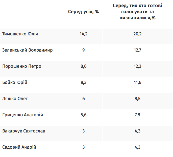 За Юлию Тимошенко готовы проголосовать 14,2% опрошенных (среди тех, кто определился с выбором, этот показатель достигает 20,2%).