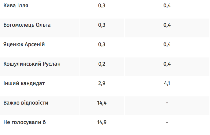 Музыкант Святослав Вакарчук получает 3% (4,3%). Председатель партии "Наши" Евгений Мураев получил 2,3% (3,4%).
