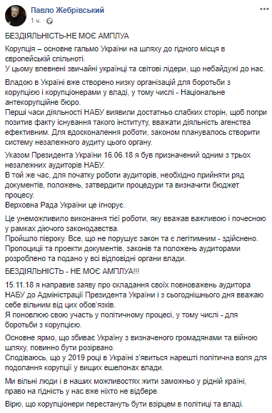 Павел Жебривский, назначенный президентом Порошенко на должность аудитора Национального антикоррупционного бюро, подал заявление об увольнении. Об этом он написал на своей странице в соцсети, объяснив, что для начала работы аудиторов Верховная Рада должна принять ряд положений и определить бюджет их деятельности, однако парламент это игнорирует.