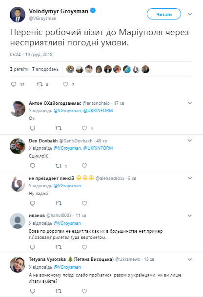 Премьер-министр Владимир Гройсман был вынужден отложить рабочий визит в Мариуполь Донецкой области из-за непогоды. Об этом он написал в Twitter.