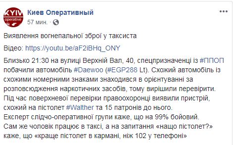 Вечером 19 декабря в Подольском районе Киева полиция задержала таксиста, у которого нашли пистолет Walther (Вальтер) и 15 патронов к нему. Об этом сообщает Киев Оперативный в Facebook.