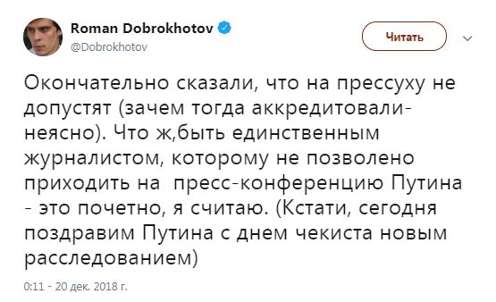 "Окончательно сказали, что на прессуху не допустят (зачем тогда аккредитовали - неясно). Что ж, быть единственным журналистом, которому не позволено приходить на пресс-конференцию Путина - это почетно, я считаю. (Кстати, сегодня поздравим Путина с днем чекиста новым расследованием)", - написал Доброхотов за полтора часа до начала мероприятия.