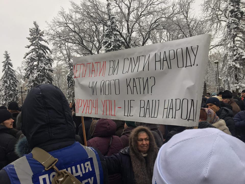 У участников акции с собой плакаты с лозунгами: "Мы украинцы и мы православные. Украина наша земля. УПЦ наша Церковь!"; "Мы молимся, чтобы Господь даровал вам ум!"; "Депутаты, вы слуги народа или его палачи? Верующие УПЦ - это ваш народ!".