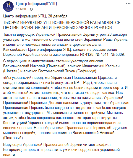 "Нас хотят лишить нашего названия, чтобы мы не назывались Украинской Православной Церковью. Должен напомнить депутатам, что Украинская Православная Церковь была создана за год до того, как было создано украинское государство. Мы молимся и ничего не требуем. Мы лишь хотим, чтобы была сохранена законность, которая гарантируется Конституцией Украины: каждый имеет право на вероисповедание и волеизъявление", - заявил епископ Васильковский Николай (Почтовый).