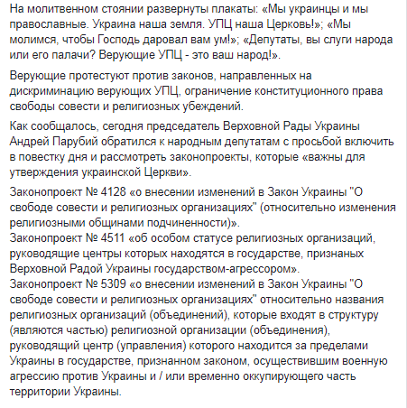 Отметим, что молитвенное стояние направлено против принятия законопроектов №4128 (об изменении подчиненности религиозных общин), №4511 (об особом статусе религиозных организаций) и №5309 (об изменении названия религиозных организаций). Последний имеет целью обязать УПЦ сменить название на Русскую Православную Церковь в Украине и запретить ей окормлять военнослужащих.