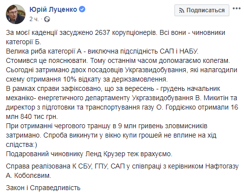 В свою очередь, Юрий Луценко заявил, что лица, которых подозревают в получении взятки в размере 25,8 млн гривен, наладили схему получения 10% отката за госзаказ. По его словам, за сентябрь – декабрь начальник механико-энергетического департамента "Укргазодобычи" Никитин и директор по подготовке и транспортировке газа Гордиенко уже получили 16 млн 840 тыс. грн. Задержаны они были при получении очередного транша в размере 9 млн грн. Также Луценко отметил, что, увидев правоохранителей, подозреваемый попытался выбросить деньги в окно.