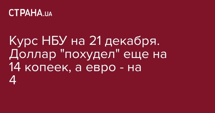 Национальный банк Украины (НБУ) установил на пятницу, 21 декабря, курс основных валют по отношению к гривне.  При этом по сравнению с предыдущим банковским днем, украинская валюта укрепилась по отношению к доллару сразу на 14 копеек - до 27,57 грн. Об этом говорится на официальном сайте регулятора.