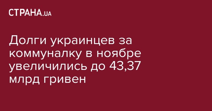За ноябрь долг населения Украины за потребленные услуги ЖКХ увеличился на 21%, или на 7 516,7 млн гривен до 43,37 млрд. гривен. Об этом сообщила Государственная служба статистики, передают Украинские новости.