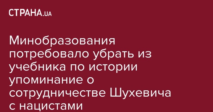 Министерство образования и науки Украины обязало издательство учебников истории Украины для 10 класса убрать упоминание о сотрудничестве Романа Шухевича и дивизии СС "Галиция" с подразделениями нацистской армии. Об этом на своей странице в Facebook сообщил директор Украинского еврейского комитета Эдуард Долинский.