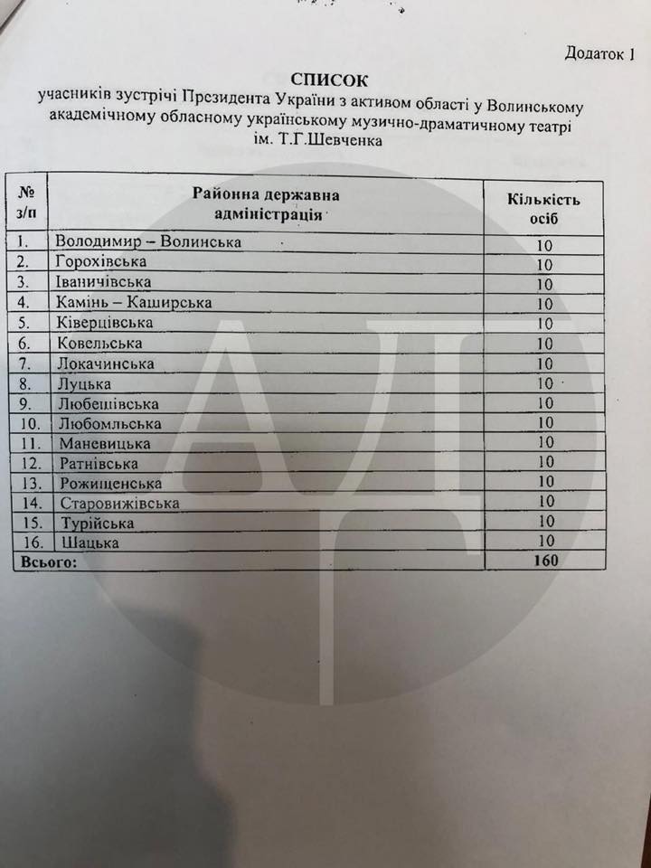 – свезти с 16 различных районов Волынской области по 10 участников для встречи президента в театре Шевченко (всего 160 человек)
