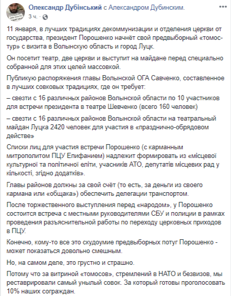 – свезти с 16 различных районов Волынской области на театральный майдан Луцка 2420 человек для участия в "празднично-обрядовом действе". Списки лиц для участия встречи Порошенко (с карманным митрополитом ПЦУ Епифанием) надлежит формировать из "місцевої культурної та політичної еліти, учасників АТО, депутатів місцевих рад у кількості, згідно додатків", - написал Дубинский.