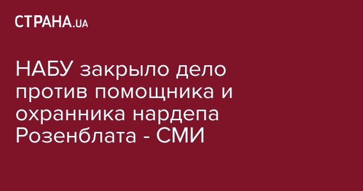 Национальное антикоррупционное бюро Украины (НАБУ) закрыло дело в отношении помощника и охранника депутата Верховной Рады Борислава Розенблата, который обвиняется во взяточничестве. Об этом Украинским новостям сообщил источник в бюро.