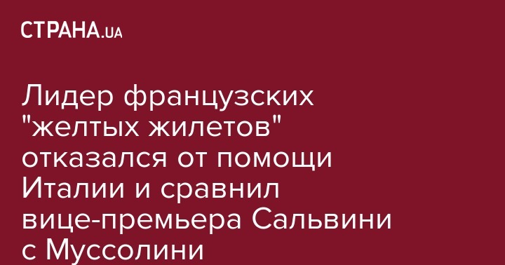 Лидер французского протестного движения "желтых жилетов" Эрик Друэ отказался от помощи со стороны итальянских властей, которую предложил заместитель премьер-министра Италии Луиджи Ди Майо. А второго вице-премьера Италии Сальвини француз сравнил с фашистским диктатором Бенито Муссолини. Об этом пишет La Repubblica.