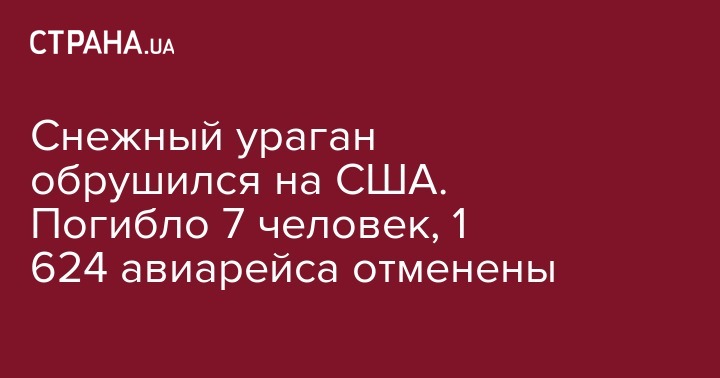 Вчера, 13 января, на США обрушился мощный снежный ураган, который привел к многочисленным человеческим жертвам. В двух штатах, Канзасе и Миссури, из-за снежной бури в ДТП погибло семь человек. В аэропортах страны вчера было отменено 1 624 рейса, большинство отмен произошло в аэропортах Вашингтога и Далласа, передает Reuters.