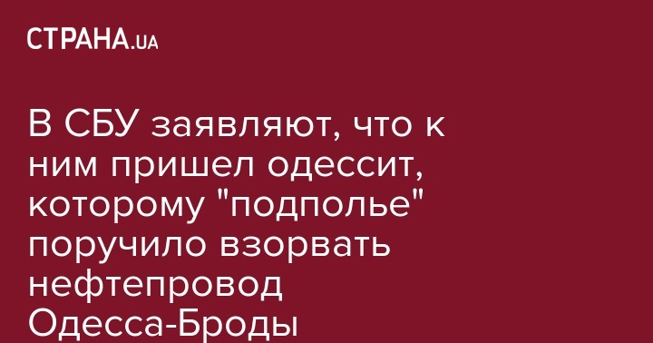 В Одессе Служба безопасности Украины заявляют, что разоблачила местного жителя, который сотрудничал с неким пророссийским "подпольем" Одесской области, которое ему якобы предложило совершить теракт на нефтепроводе Одесса-Броды. Об этом сообщает пресс-служба СБУ на странице в Facebook.