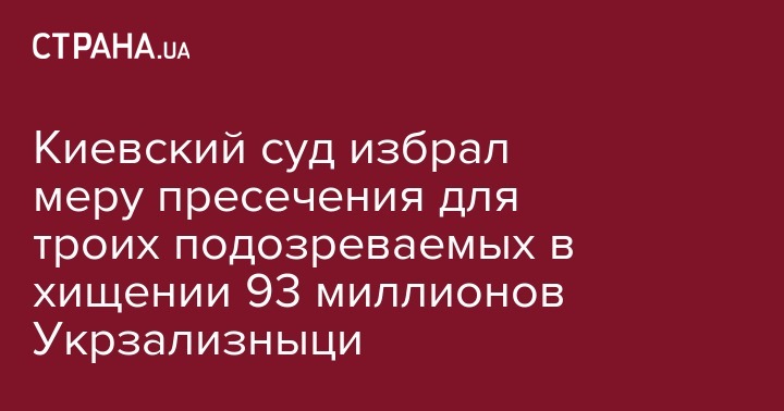 Так, двум лицам, которых подозревают в завладении 93,2 миллионов гривен, принадлежащих "Укрзализныце" избрали меру пресечения в виде ночного домашнего ареста, еще одному подозреваемому установили залог в размере 1921 тысяч грн. Также при избрании меры пресечения суд определил подозреваемым процессуальные обязанности, предусмотренные ст. 194 УПК Украины".