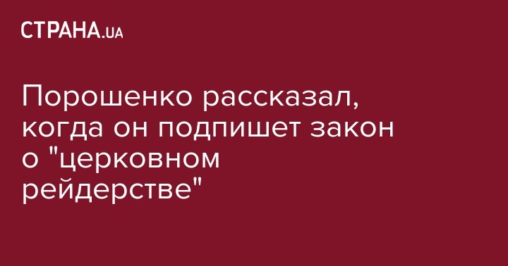 Во вторник, 22 января, президент Украины Петр Порошенко заявил, что подпишет закон "о церковном рейдерстве", определяющий процедуру перехода церковных общин в Православную церковь Украины, в ближайшие дни. Об этом глава государства заявил в ходе чествования Дня соборности Украины, сообщает "Интерфакс".