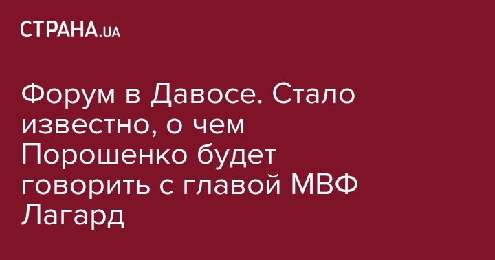 В среду, 23 января, президент Украины Петр Порошенко встретится на Всемирном экономическом форуме в Давосе с директором-распорядителем МВФ Кристин Лагард. Об этом сообщает пресс-служба Министерства финансов Украины на своей странице в Facebook.